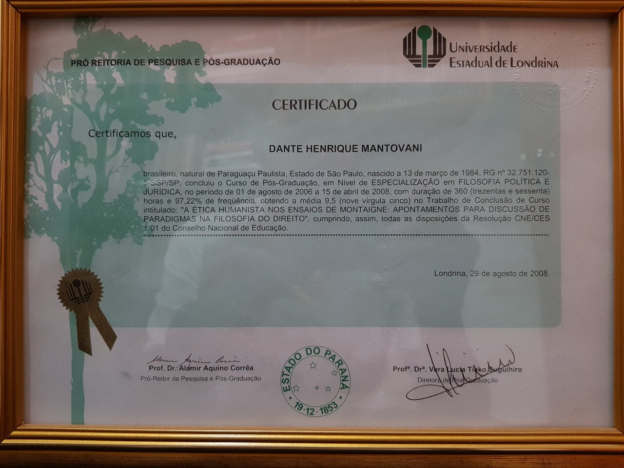 Entre 2006 e 2007, Dante retornou à Universidade Estadual de Londrina (UEL) para dedicar-se à pós-graduação em Filosofia Política e Jurídica. Sob a orientação do professor Bianco Zalmora Garcia, ele desenvolveu a monografia intitulada “A ética humanista nos ‘Ensaios’ de Montaigne”.